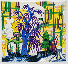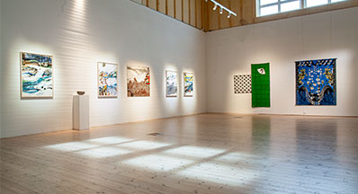 Innan man når detta hjärta passerar man först ett rum fyllt av flytande naturscener, nästan abstrakta med sina slöjlika penseldrag. Man kan förnimma doften av blött papper. Den vilt ryckiga naturen hos Billgren stramas upp och ges tydlig form i Uhlinders bildväv; här är växtligheten planterad och välskött och dess form övergår snart i rena mönster. De upplöses nästan - som de målade landskapen – fast genom att bli mer definierade, ta mer form. Det organiska i bilderna bryts ofta av skarpa linjer, en futuristisk byggnad eller en kyrka svajande som en julgranskula. Färgerna spelar på ett särskilt sätt och går man nära syns de många olikfärgade trådarna som ligger likt ett raster av pixlar i arbete.