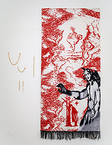 Tvärs över oceanen av golvyta i rummet hänger negativet i form av ett kolsvart sammetstyg, så djupt svart att den skapar ett sugande tomrum. Det blir en plats att vila medvetandet en stund för att sedan sondera vidare bland tråd, rök och damm.