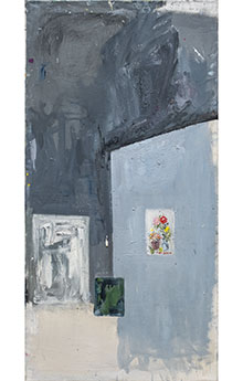 Utanför galleriet ringer kyrkklockorna till bön för den bortgångna. Det mullrar ur Engelbrektskyrkans klockspel och målningarna på galleriet svarar med sin sorgesång. Vita som minnen på gränsen till utplåning andas de med hjälp av ett minimalt spel av händelser. En inflätad ståltråd i dukens nederkant skapar resonans mot linjen i överkant, kanske markerande en husnock. Hur som helst vecklar en plats ut sig.