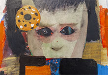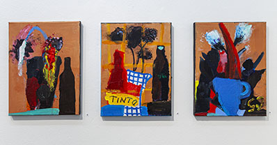 Jesus hänger på korset i en blå vas och liknar mest en sångare i något metalband. Inte långt därifrån stirrar två oroliga ögon mot oss i ett kollage med texten “konstnärs sjuka”, en bekant blick fylld av ekonomisk ångest och mild panik. Allting dansar fram som en avväpnande handgest i målerisk form, upproriskt utan agenda, en överlevnadstaktik. Färgen glider av en slokande blomma som upphettad senap och ketchup från en varmkorv. Det är intensivt även i de allra minsta målningarna.