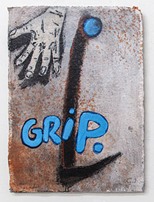 Den platta handen återkommer och nu klappar den sig tafatt fram mot en hacka med trähandtag. “GRIP.” står det med stora blå bokstäver tvärs över bilden, men handen fortsätter bara treva. Hackans spets är inte vass, den rinner iväg som trög vätska ner mot dukens kant.