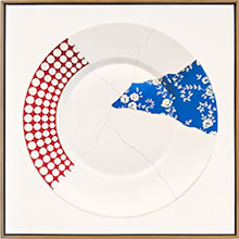 Men något har hänt med tallrikarna mellan kraschen och den varsamma restaurationen. Istället för att skärvorna funnit sina likar har de hoppat runt i något slag av kalejdoskopiskt busstreck där inget mer än den ursprungliga tallriksformen är i behåll i slutresultatet. Till detta kommer själva mödosamheten i tillblivelsen. Istället för att hänga upp hoplimmade skärvor av en gång verkligt närvarande porslinstallrikar är allt målat i olja på duk – fast realistiskt så det förslår.