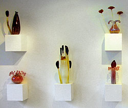 Gunilla Kihlgrens glas är ofta massivt och utstrålar tyngd och massa. I de verk hon nu visar på Sintra finns en enkelhet i själva formen, som gör det innehållsliga ännu starkare. En tidlös vasform, som tycks hämtad från antiken innesluter barockens hela överdåd i sitt transparenta inre. Jag tänker på den magnifika glaspjäs hon har kallat ”Aorta, massiv vas”. Det är ett fascinerande verk som inte släpper taget om betraktaren. Djupt därinne i det klara glaset hänger en väldig brunröd form, aortan, som en manslem, omgiven av röda till synes flytande kroppar. Beroende på betraktarens vinkel förändras färgspelet inne i den fulländade glaskroppen. Och lite retfullt sticker en strimma klarrött mot ytan. Det är flott!