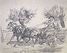 Den skånske konstnären Hjalmar Asp (1879-1940) är i motsats till Helmtrud Nyström en doldis på konstscenen, antagligen är utställningen på Tomarp hans mest omfattande någonsin. Det skånska landskapets människor, gårdar och djur framträder med hastigt tecknade linjer. Älsklingsdjuret är utan tvekan hästen, i trav eller galopp, gärna tillsammans med militärer.