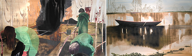 Svaren får vi kanske här, på den aktuella presentationen, där Mamma Andersson är tillbaka med de stora flödande landskapen, med det grafiskt renodlade bildspråket och med det tålamodskrävande arbetet att vänta ut effekterna av de flortunna akryl- och betslasyrerna. Resultaten är ofta häpnadsväckande – så enkelt och så bildspråkligt effektivt. Så arbetar bara den som vet att nyttja materialets inneboende möjligheter och egenheter. Här härskar den kemiska bitningsprocess där betsen tillåts att äta sig in och torka upp i samspel med panelernas förgrenade träådring, som i den drömska målningen "Memory Bank". |