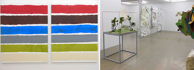Jag kan inte se norrmannen Ståle Volds (född 1951) Measurement paintings som annat än en blinkning mot detta inre uppror (i det förflutna). Även Vold visar, med sina febrigt knyckiga, horisontella, färgband, på ett tillstånd av mänsklig borderline – på gränstrakten mellan himmel och helvete. Och snabbt går det, de akrylmålade färgbandens oregelbundna konturer leder tankarna till i all hast rivna kulörta pappersark, till något först saboterat och sedan nödtorftigt hoplappat (till ett oreflekterat spontanistiskt collage). Den som söker efter figurationen skulle kunna härleda färgbanden till ett öde, stilla och vackert, landskap med horisonter staplade på varandra.