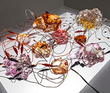 Materialen, händerna och tanken söker i intrampade spår, men det intressanta är hur sömlöst och nyfiket man utvecklar med hjälp av nya tekniker, om det så är materialkollisioner rent tekniskt där stickning möter glasblåsning som i Carl Cyréns objekt. Evelina Kollberg sätter an tonen i Vita havet med sin knutna eller virkade skulptur ”Människofällan” som självklart promenerar eller larvar sig ut i rummet som en ständig påminnelse om att liv uppstår i betraktarens öga. En explosion av händelser löses ut direkt vi entrén, men utan att de mer lågmälda uttrycken sätts på undantag. Sofia Kråkas collage av teckningar skänker diskbänksrealism ny mening som poetisk eskapism i små underfundiga akvareller med exempelvis porträtt av wettexdukar, post it-lappar och köket satt i diminutiv.