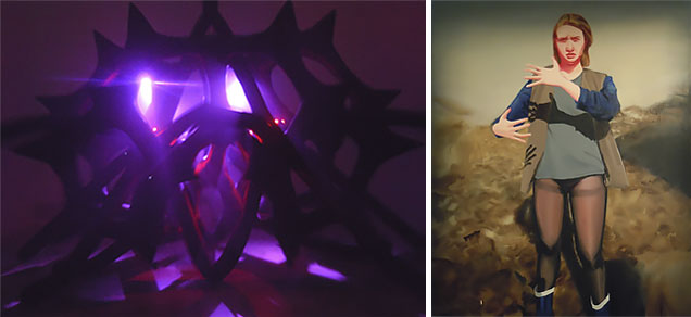 Teknik och artificiell intelligens – Matti Kallioinens mäktiga installation ”Homunculus” fyller ett helt rum. En både vacker och kuslig upplevelse om kontroll och makt. Och att ta makten över skapandet kan antingen få börja eller avsluta utställningen – i foajén har Amara Por Dios gjort en färgstark muralmålning på ena långväggen. ”Den inre kampen” – säger en hel del om skapandets villkor.