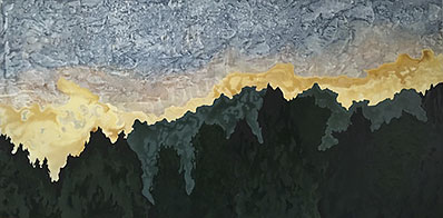 De två dukar i samma storlek som dominerar väggarna på sidorna går åt andra hållet. Hanegäll har en kristalliserad himmel över taggtrådsartade bergsformationer. Hårt regn är lika vass och dramatisk.
