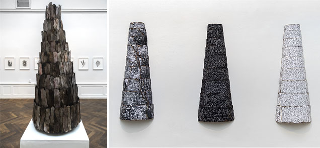 Marketta Ivarsdotters utställning och bearbetning av denna svårgripbara process väcker även insikten om ordens nästintill obegripliga ytverkan och mönster mot de vita arken. Lösningen som accepterar tillståndet ter sig självklar i Ivarsdotters händer. Sidorna skrynklas och mättas med grafitpulver som stängda dörrar till minnets bibliotek. Orden flagnar och läggs i skålar. De brända textfragmenten sys ihop av ärrbildningens röda trådar. Om hon sedan menar att dessa inre oläkbara sår varar tills man så småningom underställer sig dem, fogar sig, må vara osagt. Vardagssorgen får sin hemvist och lyfts fram i ljuset som hyllningar till livet. Livets alkemi söndrar och återförenar, lever under ateljéarbetet och ges en värdig form. Utställningens ingående delar med rader av inramade fragment, med skulpturala avbrott fungerar osedvanligt väl i Stora Galleriet.
