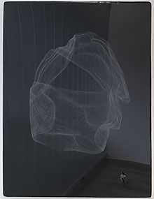 Adrián Espinós tredelade verk med måleri, objekt och graverat plexiglas fångar mitt intresse lite extra. Den svarta plexiglasskivans inristade rök-ringsaktiga form svävar suggestivt på ett märkvärdigt vis.
