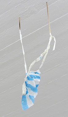 Vid sidan av dessa möter sedan Margrét H. Blöndals omsorgsfullt ihoplappade tygstycke Untitled (2020) lågt ner på väggen. Blickar man upp syns hennes skulpturala installation Untitled (2012) dingla från taket. Bestående av fragil tejp och plast är den senare nog varje konservators mardröm, och vid första anblick framstår verket snarast som rester från en omhängning. Men samtidigt övertygar de vardagliga nyanserna på ett underligt vis, och man hoppas att klistret inte ska släppa från taket.