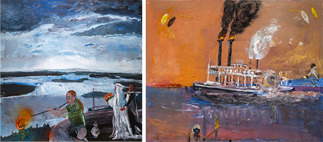 Men från Tilpo är ändå steget relativt långt till både Billgren och Bengtsson, även om likheter finns. Kanske är det den spontanistiska angreppsmetoden som främst skiljer. Svepande utfall och ett nervigt anslag formar distinkta figurationer i ett vått-i-vått-måleri man sällan ser hos akrylmålare. Konstnärsduon Tilpo visar på en tydlig drivenhet i teckning och linjeföring, det är helt klart. Men drivenhet är enbart en teknik, det är i berättarviljan och de drastiska associationsbrotten de visar som störst prov på sin konstnärliga autonomi.
