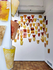 Denna levda kropp utvidgas genom måleriet och tar plats i rummet med en eteriskt skimrande lätthet. Med inrullade sidor smälter målningarna in i väggen. Här finns inget skrämmande och kusligt, snarare något sublimt, trevande och utforskande, en nyfikenhet utan rädsla. Jag påminns om de fladdrande tygsjoken i germanskt renässansmåleri, hos en Matthias Grünewald exempelvis, aktualiserat av den nyss timade påskhelgen.