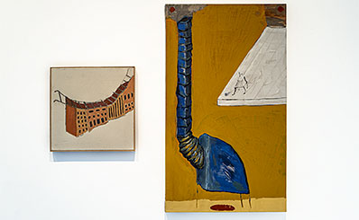 I projektrummet (en trappa ned) visar samtidigt Matti Hoffner några av sina bastardliknande assemblage och objekt. Jag såg hans verk på Konstfacks vårutställning 2025, där han tog sin kandidatexamen, och blev omedelbart intresserad av de överrumplande sammansättningarna (se länk nedan). Det handlar ofta om helt disparata objekt, som hämtade ur närmaste container, men som här förenas i gestaltliknande kammarspel. Och även om intentionen förmodligen inte är att betraktaren ska läsa in människoliknande figurer så bidrar dessa associativa tankelöpor ändå till den totala bilden av en värld fylld av turbulenta dramer. Som i skulpturen Utan titel (se bild) där ett slags keramiskt "kartongbygge" förvandlats till en semimodernistisk abstraktion som lite svajande inlemmar sig i den totala presentationen.