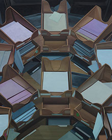 Den här gången hittar man inga stolar – vilket kanske är lika så bra – men åtminstone en målning med böcker. Som alltid torrt men vackert målade böcker i fritt fall som fyller hela bildytan. En sorts torr men sensuell realism som, i denna och många andra av Hammouds målningar, tycks stå på gränsen till abstraktion. Att en halvöppen bok visar en sida med en bild som uppenbart blinkar till Edward Hoppers målning Rooms By The Sea utgör en konstnärlig referens att addera till de redan nämnda.