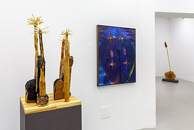 Intill målningarna står träskulpturer där de levande formerna får en annan fysisk närvaro. Träet är hugget, skuret och raspat. De grova och talande dragen blir som en direkt överföring från måleriets kraftfulla men ändå inkännande rörelse. Olika material men samma uttryck, samma röst som talar. Det levande träet har avklätts och formats till uppförstoringar av annat levande och spirande. Dess åldersringar ligger synliga och påminner oss om cyklisk tid.