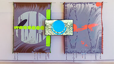 Konstnärsduon Metahaven (Vinca Kruk och Daniel van der Velden) visar vävda textilier med abstrakta mönster sida vid sida med dataprojektioner med ett likartat estetiskt uttryck.