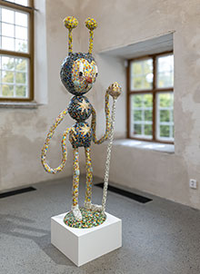 Joakim Ojanen (f. 1985, Västerås) fick efter sin examen från Konstfack (2015) relativt snart en lyckosam internationell lansering. Hans ofta absurt skruvade, men naivistiskt kärleksfulla, keramikskulpturer togs emot väl på den amerikanska konstscenen. Redan 2017 ställde han ut i New York (se länk nedan) och är numera ganska så sällan visad i helfigur i Sverige. Så den omfattande utställningen med elva verk på Hospitalet i Stockholm är ett tacksamt återseende av denna särpräglade konstnär. Få visar en sådan kreativ produktivitet och har ett sådant berättardriv i tredimensionella material som Joakim Ojanen.