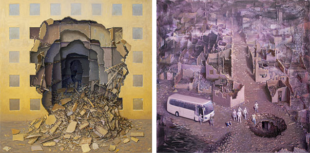 I en av de större målningarna ser vi resterna av en vit byggnad. De urblåsta rummen anas endast genom rutmönstret i de kvarvarande väggarna. De står uppradade som dystra kulisser i en krigslek. Kanske är allt en skildring av en lek i miniatyr, ett dockskåp som spårat ur, eller som snarare har lekt fram en helt annan verklighet.