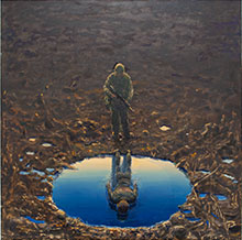 Kratern spelar en central roll i flera av målningarna. Den förvandlas från ett hål till en grop till en sjö. I en av bilderna ligger tre svepta kroppar intill gropen där en man står och gräver. I nästa målning står en militär med gevär och ser ner på en död kropp som flyter med ansiktet nedåt i den nu vattenfyllda kratern. I en annan målning förvandlas kratern till en underjordisk sjö där några människor har klivit ner. Gropen blir en konstant, ett vittne till allt som sker kring den.