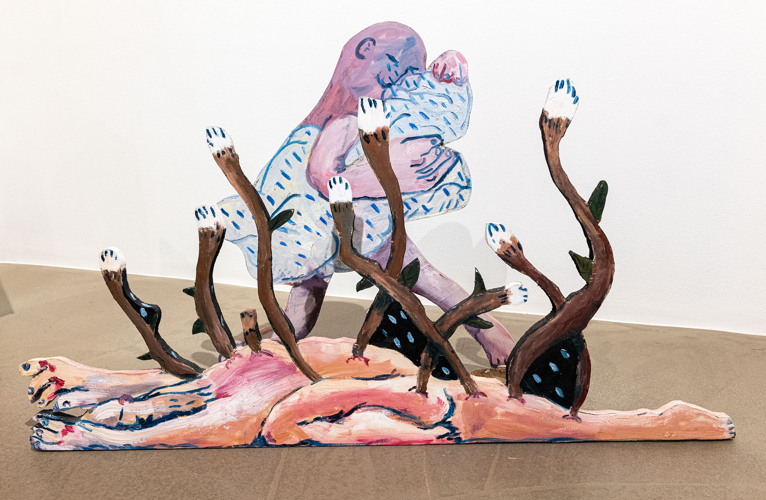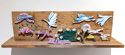 Människosöner bugar, bockar och böjer sig och tyngs. De lösgörs under sina predikament. Våren växer och knoppar brister som aliens direkt ur hudens tunna barriär (minns filmen). Andra flyr med fjäderdräkt och låter Emily Dickinsons strof ”Hope is a thing with feathers” få en rent sinister innebörd. Jesper Thours verktygslåda har utvecklats till tablåer i tre dimensioner, snidade figurer, måleri och objekt som flödar in i och genom varandra. Självklart är skogen rätt plats att stöpa om till en stenkaka, eller åtminstone en akustisk dröm och hemsnickrad skivspelare.