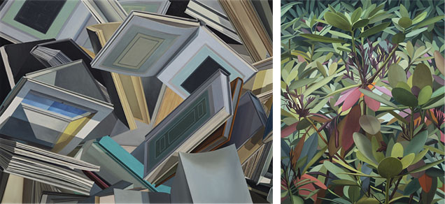 Den här gången hittar man inga stolar – vilket kanske är lika så bra – men åtminstone en målning med böcker. Som alltid torrt men vackert målade böcker i fritt fall som fyller hela bildytan. En sorts torr men sensuell realism som, i denna och många andra av Hammouds målningar, tycks stå på gränsen till abstraktion. Att en halvöppen bok visar en sida med en bild som uppenbart blinkar till Edward Hoppers målning Rooms By The Sea utgör en konstnärlig referens att addera till de redan nämnda.