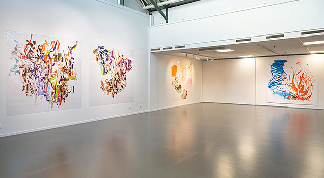 Utställningen är stramt hängd, de flesta verken håller formaten på runt två gånger två meter. Dessa skapar varsina rum med ett maximalt kroppsligt omfång för en människa att röra sig i, eller ställa sig i förhållande till.