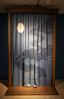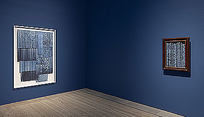 Det sceniskt dunkla fortsätter in i nästa utställning. I ett skymningsblått rum rör sig ett långsamt skuggspel, en animerad vandring i sidled. I Johan Thurfjells verk befinner man sig inte mitt i ett skådespel utan i tystnaden precis innan ridån dras åt sidan. På väggarna hänger små fördragna draperier i samma blåa ton, inglasade och inramade. Det anspända ögonblicket av tyst förväntan är här inkapslat och förvarat, hemligheten förblir förseglad och bevarad.
