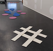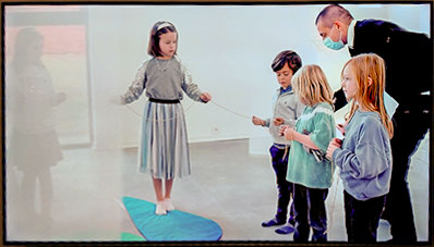 Längst stannar jag framför Luca Lee Freis meditativt lugna video Kunstendag voor Kinderen där små barn utför en slags rituell lek med snören till ljudet av knäppande musik – alltmedan vuxna, iklädda munskydd, varsamt övervakar och styr. Till detta slinker konstnärens minimalistiskt geometriska små tygstycken på golvet smidigt in. Det är en, bokstavligt talat, mjukt lågmäld estetik som stramt och stumt tar rummet i besittning.