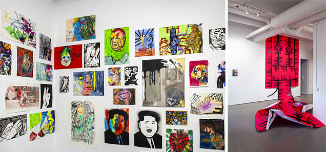Intill två porträtt av Nordkoreas ledare Kim Jong-un med slipade, vassa tänder hänger ett porträtt av en hund med stora sorgsna ögon. Det hoppar och växlar genom målningarna, hojtar och viskar om vartannat. Det hela hade kunnat bli visuellt övermäktigt men utställningen är återhållsamt hängd och verken får plats att andas. Svartvita och blyertsgrå bilder varvas med de mer färgintensiva och skapar ytterligare pauser.