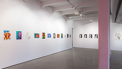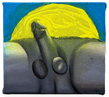 Det flyter, putar och hänger. Svällande manliga magar och kön fyller bilderna på väggarna, kroppsnära och aggressivt vid första anblick. Både motiven och färgskalan slår direkt mot hornhinnan och gör det svårt att vika undan, samtidigt är det i detta kvardröjande som bilderna öppnar upp sig. Mitt i det raka och råa finns en ömsinthet, en brydd och varm hand som styr alltsammans.