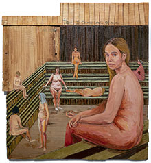 Perspektiven är ofta halsbrytande konstiga, på ett lika typiskt som uppfriskande naivistiskt sätt. Det är mästerligt gestaltat på en större målning inifrån en gigantisk bastu med, får man anta, konstnären själv sittande i förgrunden men där en av kvinnorna längre ner och längre in är helt orealistiskt liten. Det är en bild som – liksom hela den personliga utställningen, de färglagda teckningarna ej att förglömma – fångar mig på ett både konstnärligt och känslomässigt plan. Det händer alltför sällan.