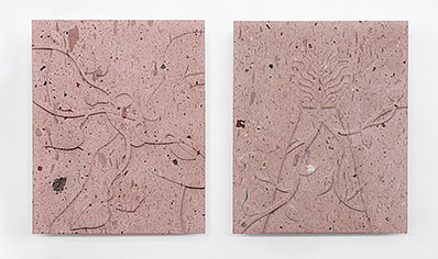 Verken i olja på duk, på papper och i stenrelief kretsar kring relationen mellan människan och jorden. Titeln, av jord och viskningar, antyder att det är en relation som behöver en mer känslig uppmärksamhet. Tankar hämtas från ekofeminismen, formulerad på 1970-talet av den franska teoretikern Françoise d Eaubonne. Här förstås exploatering av naturen och förtryck av kvinnor som parallella uttryck för samma utarmande levnads- och tänkesätt. I ekofeminismen ersätts linjärt framstegstänkande med värden som fertilitet och kretsloppstänkande.