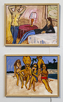 Längst in i galleriet möter vi ett helt annat slags måleri. En vardaglighet rycker oss bort från orosmolnen och drar oss med i semesterbilder, tandläkarbesök och utekvällar. Lars Nilssons bilder är målade med en lättsamhet och en humoristisk distans, penseldragen är grova och förlåtande. Färgerna är klara och himlen lyser blålila bakom rodnad hud. Människorna här tar hämningslöst för sig av det som bjuds, utan vidare betänkande. Efter en stund kryper orosmolnen in i rummet och ansiktena ter sig plötsligt mer groteska, sorlet stegras och rösterna försöker överrösta varandra.