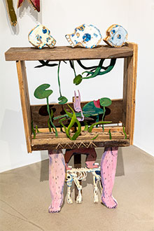 Näckrosbladen flyter som heliumballonger och skapar ett viktlöst tillstånd i det första rummet. Som betraktare och drunknande leds man via dem under tystnad in mot utställningens epicentrum. Därefter skruvas volymen upp ju fler verk man tar del av. Bakom ryggen mot den svarta filten snattrar alla gemensamma birollsinnehavare ut sin absoluta tro på att tillhöra fokus eller alltings mitt. Apan och Geten och han som bär skallen dividerar utan att nå en lösning. Samtidigt är flera självutnämnda antihjältar på flykt undan tigerhjärtan eller räds risken att sväljas hela av en grodkäft. Drömmar, sanningar och vanföreställningar klättrar längs väggen.