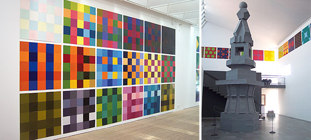 Kombinationen färg och geometri når en grand finale i arkitekturen, byggnaderna. Inne i Lunds konsthalls stora entrésal reser sig konstnärens mastodontiska ”Torn” (av papp) nästan ända upp till taket, på väggen intill finns hans tecknade, och trappstegspyramidformade, ”Helhetsskiss till Gröntorv, Köpenhamn” vilken även finns som tredimensionell modell. |