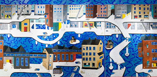 Det blåser snålt kring husknutarna i Kristina Abelli Elanders stora triptyk "Kilroy was Never Here". Söndertrasade morgontidningar dansar i vinden bland tomma konservburkar och demolerade cykelhjul. Och så överallt dessa trappor och övergångar mellan (betydelse)nivåer. Dörrar, fönster, ingångar och utgångar. Men framgångar? Knappast. Inte i dessa nedslitna, statuslösa kvarter. Åtminstone inga ekonomiska sådana. Men medmänskliga då? Svårt att säga då det som bjuds är människornas restprodukter och artefakter. Ändå finns där ett värmande gemyt, en tillåtande, mänsklig skevhet i huskroppar och gatuvindlingar. Som om arkitekturen iklätt sig rollen av att på ytan spela upp alla de dramer som väggarna döljer.