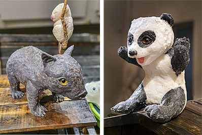 En panda, två koalor, en orangutang, en giraff, en elefant och ett antal fler av världens utrotningshotade djur har fått plats på Hannas ark. De är kärleksfullt naivistiska men aldrig barnsliga. Visst återkopplar Hanna Beling till en hel tradition av mjukis- och gosedjur som vi förmodligen alla haft en starkt personlig koppling till sedan barndomen. Men här tillkommer en djupare konstnärlig beskrivning av fysionomier, gester och poser. Det gör att man som betraktare kastas mellan barnets identifierande reminicenser till den vuxnes fascination över uttrycken och hantverket.