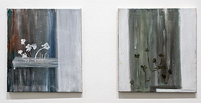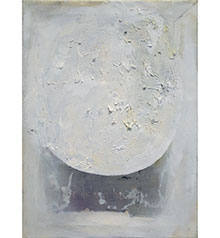 Utanför galleriet ringer kyrkklockorna till bön för den bortgångna. Det mullrar ur Engelbrektskyrkans klockspel och målningarna på galleriet svarar med sin sorgesång. Vita som minnen på gränsen till utplåning andas de med hjälp av ett minimalt spel av händelser. En inflätad ståltråd i dukens nederkant skapar resonans mot linjen i överkant, kanske markerande en husnock. Hur som helst vecklar en plats ut sig.