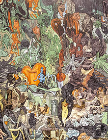 Tunna svarta tuschstreck löper utmed formerna, men trots denna bildens punktmarkering är formerna inte låsta utan rör sig vilt och fritt över ytan. Vi följer virrvarret genom ändlösa rum och riktningslösa trappor.