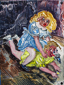 Knattrande små fötter springer ivrigt upp och ner i trappor samtidigt som en kaskad av prunkande växtlighet forsar in genom bildens alla rum. Kroppar och natur sammanvävs och väller fram i Peter Köhlers vildvuxna scenerier. Här blandas drömmar med sagor, myter och gotiska demoner. Bilderna är detaljerade och tidskrävande, varenda millimeter pappersyta har bearbetats och vid minsta ögonrörelse upptäcks något nytt. Färgerna lockar in, turkos och korall blandas med kaki och skuggrönt.