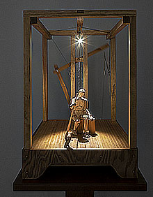 En liten trädocka, mekaniskt bunden vid en scen i trä, försöker gång på gång resa sig från en stol men hindras av sina trådar. Denna evinnerliga upprepning till trots har den ändå något vilsamt över sig, som om den har accepterat sitt öde, blivit ett med premisserna och finner sig i den repetitiva rörelsen.