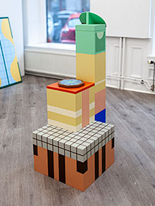 Några målningar har frigjort sig från väggen och landat på golvet som tredimensionella objekt, sammanbyggda som stilistiska huskroppar. Perspektivet förskjuts efter en stund och objekten blir något annat än ren representation, inte längre låsta i sina positioner utan lekfullt sammansatta. Det är som en promenad i en virtuell stadsmiljö där vi dras mellan närhet och distans, trygghet och olust. Färgerna drar effektivt till sig betraktarna som flugor till sockrade bakverk, och man rör sig försiktigt genom denna attraktiva minnesvandring i dissekerad stadsmiljö.