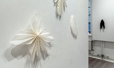 Några vikta pappersark hänger också som vilande vingar på träkrokar och det tunna papperet ges tyngd. I fönstret ligger två skrynkligt vilda pappersark med kraftiga metallringar som klämmer åt dem på mitten, fäster dem med en bestämdhet mot underlaget och hindrar dem från att lättsinnigt sväva iväg. Genom att låta sig vikas förstärks papperet, genom att ge med sig skapas en stabilitet.