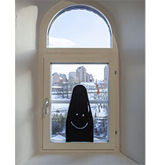 På fönstren i det större rummet sitter svarta former uppsatta på glaset, som missiler är de riktade ut mot himlen och ler käckt mot oss med sina smiley-ansikten. Det finns en underliggande ström av något hotfullt, en krypande jakt efter dominans som förtydligas genom återkommande porträtt av diktatorer och världsledare. Ett pumpande våldskapital med erekta missiler, infantilt riktade som i en försenad trotsålder. I Korkeilas bilder framträder detta oförutsägbara som vågor mellan det groteska och det bekanta. Med tuschlinjer avtecknar sig Kalle Anka och Musse Pigg bland penisar och ansikten, lite skeva och härjade men igenkännbara lik förbannat.