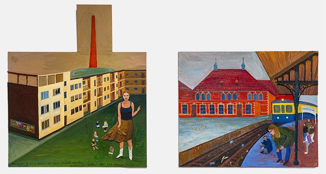 Precis som utställningstiteln antyder odlar Nadolle ett självironiskt, humoristiskt drag. Jag läser mig till att det till stor del handlar om henne själv och vardagslivet som ung kvinna i Warszawa, vilket för övrigt inte verkar skilja sig från livet här i Sverige. Vi möter henne i stadsmiljöer och i hemmet. Hon önskar att hon och pojkvännen kunde ha samma musiksmak och undrar om Zoloft – tablett som behandlar ångest och depression – går att ta under graviditet. Några bilder visar henne i skolmiljö: en tudelad liten olja visar dels en skolgård ur fågelperspektiv, dels en rörande scen med en skamsen elev som kissat på sig, onekligen ett ovanligt motiv.
