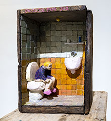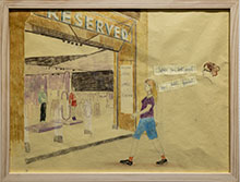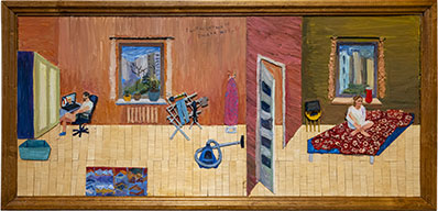 Perspektiven är ofta halsbrytande konstiga, på ett lika typiskt som uppfriskande naivistiskt sätt. Det är mästerligt gestaltat på en större målning inifrån en gigantisk bastu med, får man anta, konstnären själv sittande i förgrunden men där en av kvinnorna längre ner och längre in är helt orealistiskt liten. Det är en bild som – liksom hela den personliga utställningen, de färglagda teckningarna ej att förglömma – fångar mig på ett både konstnärligt och känslomässigt plan. Det händer alltför sällan.