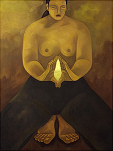 Hilda Palafox parar ekofeminismen med bildelement från förkolumbiansk bildtradition. Människogestalterna är inte alltid entydigt genuskodade, och snarare än kvinnor i motsats till män handlar det om sätt att förhålla sig till världen som traditionellt associerats med kvinnliga sfärer. Viskningarna i Palafox konst handlar om vad jorden försöker säga om förödelse, läkande och pånyttfödelse.